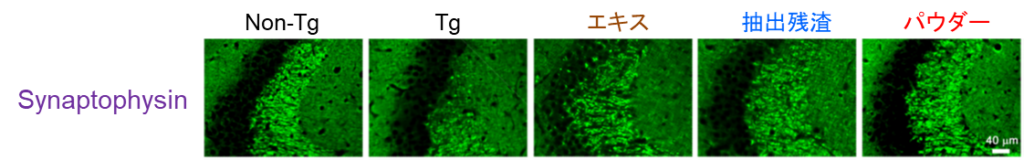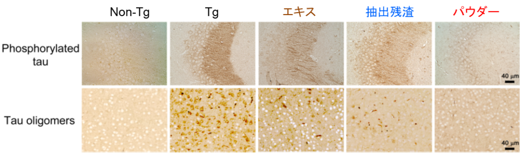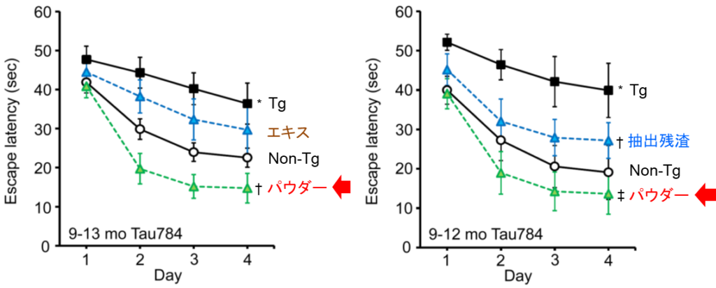 アルツハイマー病と類似した症状を持つマウス(Tau784マウス)に1ヶ月間投与した実験では、熱水抽出物(エキス)と抽出残渣は記憶力を改善する効果が限定的だったのに対し、シンプルクラッシュパウダーは、健常な同月齢マウスをも上回るほどの顕著な記憶力向上効果を示しました。