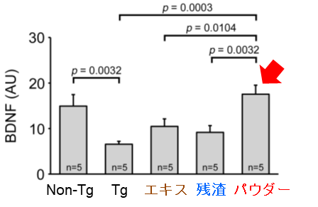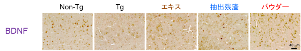 さらに、神経細胞の成長や再生を促進する**脳由来神経栄養因子(BDNF)**の発現量も、シンプルクラッシュパウダーを投与したマウスで健常な同月齢マウスよりも増加していることが確認されました。これらの結果から、シンプルクラッシュパウダーは病気の原因となるタンパク質の除去だけでなく、損傷した神経細胞の修復にも非常に効果的であることが示唆されました。