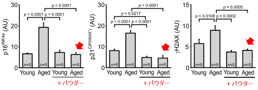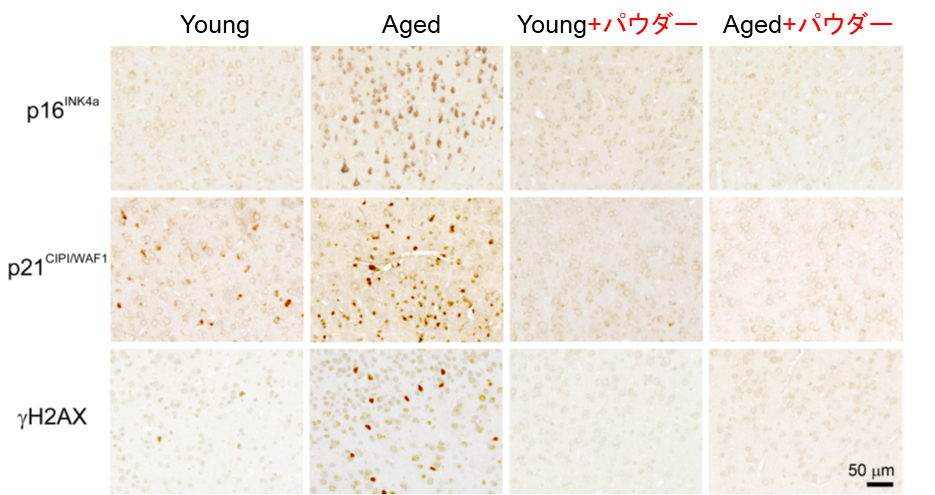 - 脳の若返り効果:病気ではない通常の高齢マウスに酸棗仁パウダーを投与したところ、低下していた認知機能が若齢マウスと同等のレベルまで回復しました。この効果は、脳内のDNA酸化や細胞老化のマーカーを減少させ、若齢マウスに近いレベルに戻すことに関連していました。